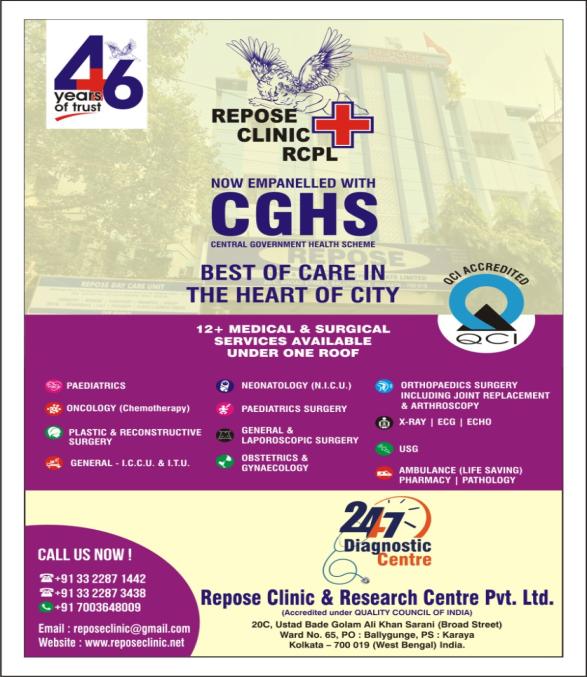 Repose Clinic & Research Centre Pvt. Ltd. is a beacon of light for the suffering for over 45 years. Situated in the middle of South Kolkata (20C,Ustad Bade Golam Ali Khan Sarani (Broad Street).Ballygunge,Kolkata-700019.), the Nursing home is renowned for its medical expertise, excellent nursing care and quality diagnostics. Specialists on the Nursing home’s panel of Specialized doctors include some of the most distinguished names in Indian Medical Profession. This Nursing home has earned recognition for success rate in infertility solutions. For patients, it’s a sanctuary for the healing of mind and body.